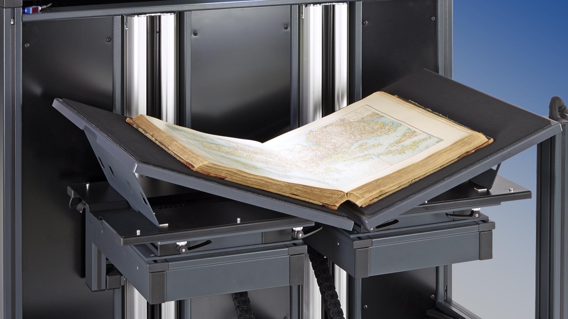 The motor-driven book cradle handles books up to 35 cm high, with an optional upgrade to 50 cm, making it perfect for digitizing standard and oversized materials. Operators can easily switch between flat mode for open books and V-mode with a 140° opening angle to protect delicate spines and bindings.