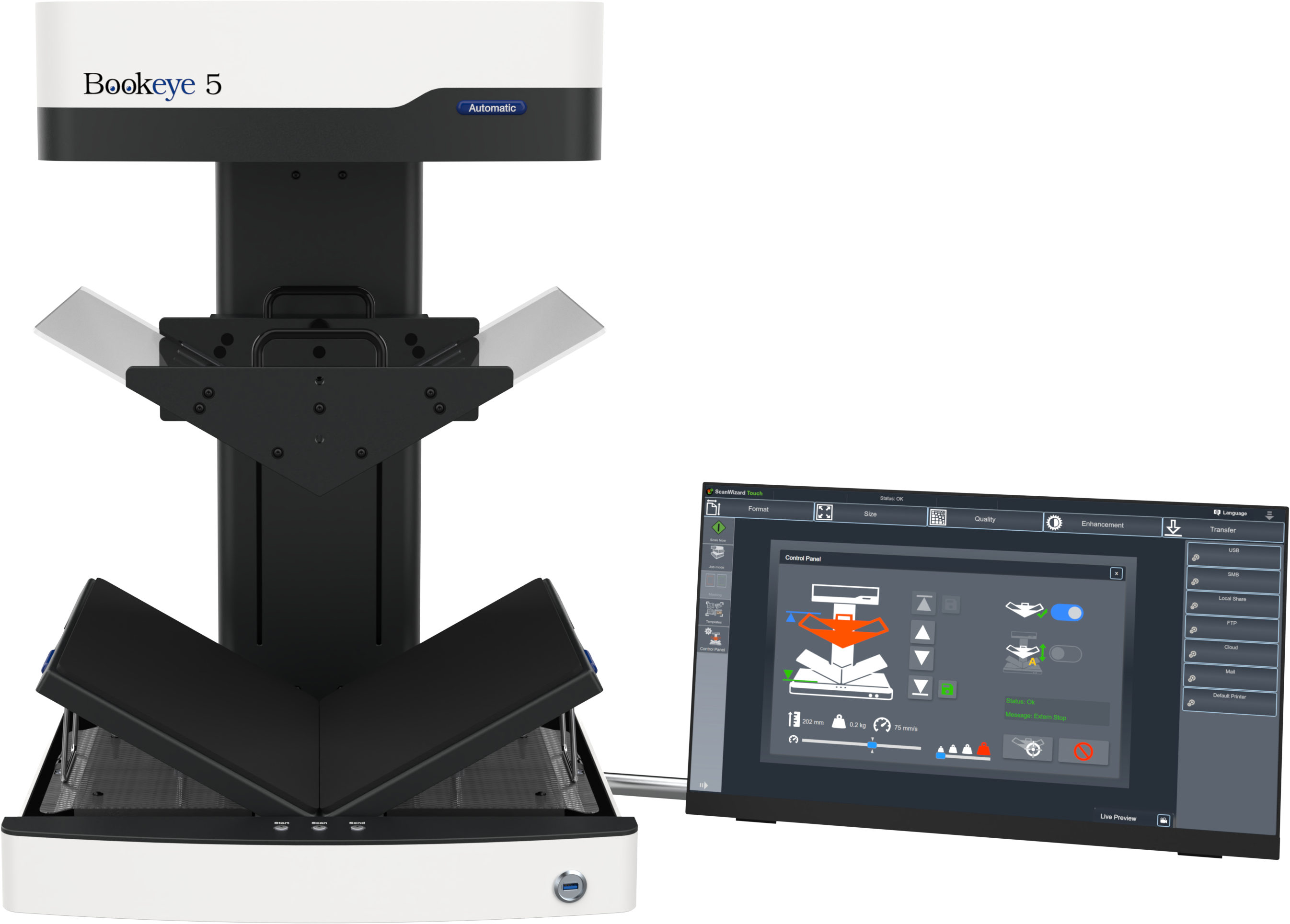 Thanks to its very small footprint and a weight of just 31 kg, the book scanner fits comfortably on any desk or workspace. The integrated installation wizard prepares the BookTEK 5 for operation only a few minutes after unpacking.